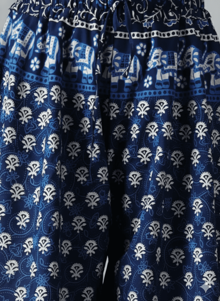 The rich navy blue color adds a classy touch, while the Sanganeri printed design brings out a unique blend of modern and traditional artistry. Featuring an elastic waistband with a drawstring closure, it offers a flexible and secure fit for every body type.
